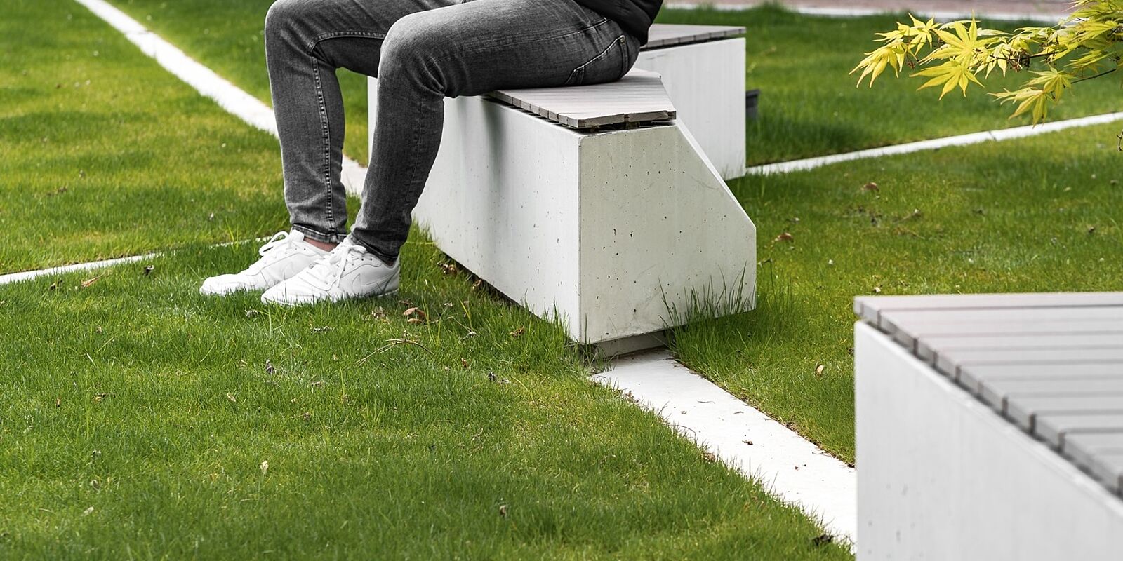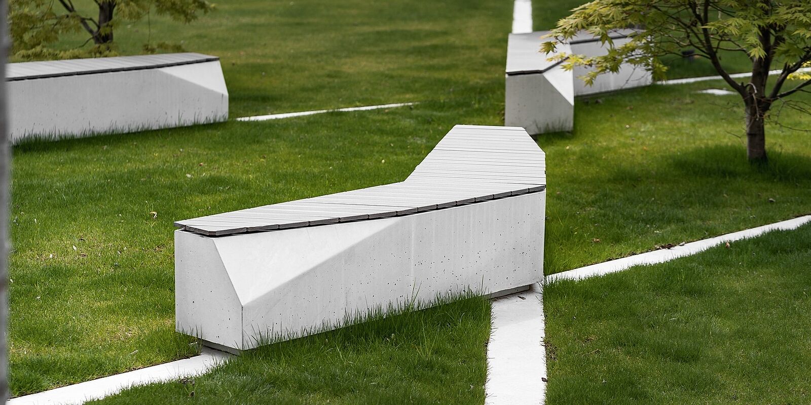 Die Kombination aus komplex geformten Sitzelementen und passgenauen Randsteinen unterstreicht den hohen gestalterischen Anspruch des Projekts und zeigt die Möglichkeiten von Beton als frei formbares, architektonisches Gestaltungselement im Außenraum.