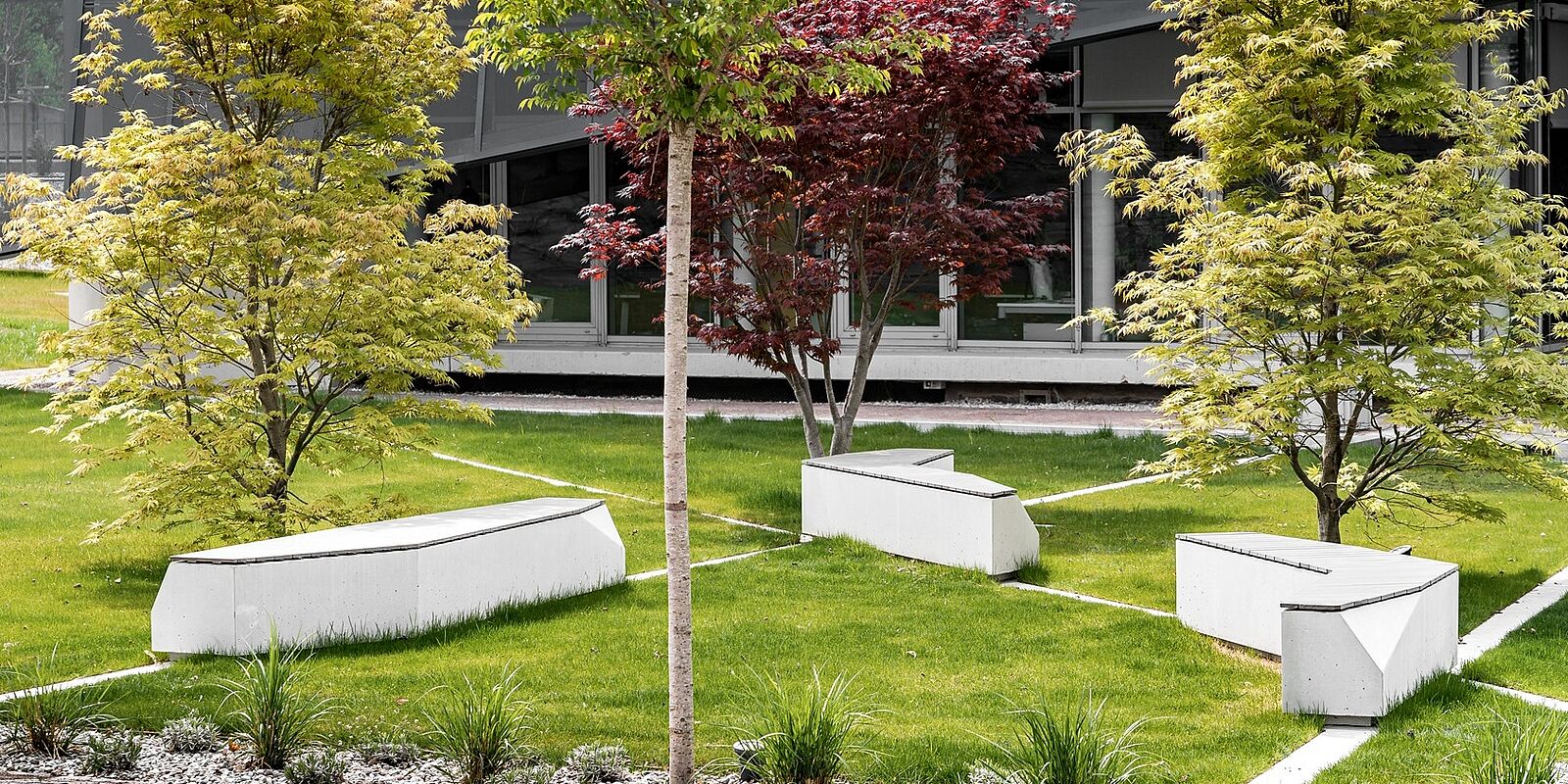 Für den Außenbereich der ECO Center AG in Bozen wurden individuell gefertigte Sitzelemente aus Beton realisiert. Ergänzend dazu kamen maßgefertigte Beton-Randsteine zum Einsatz, die speziell entwickelt wurden, um den Linien und Radien der Architektur präzise zu folgen.